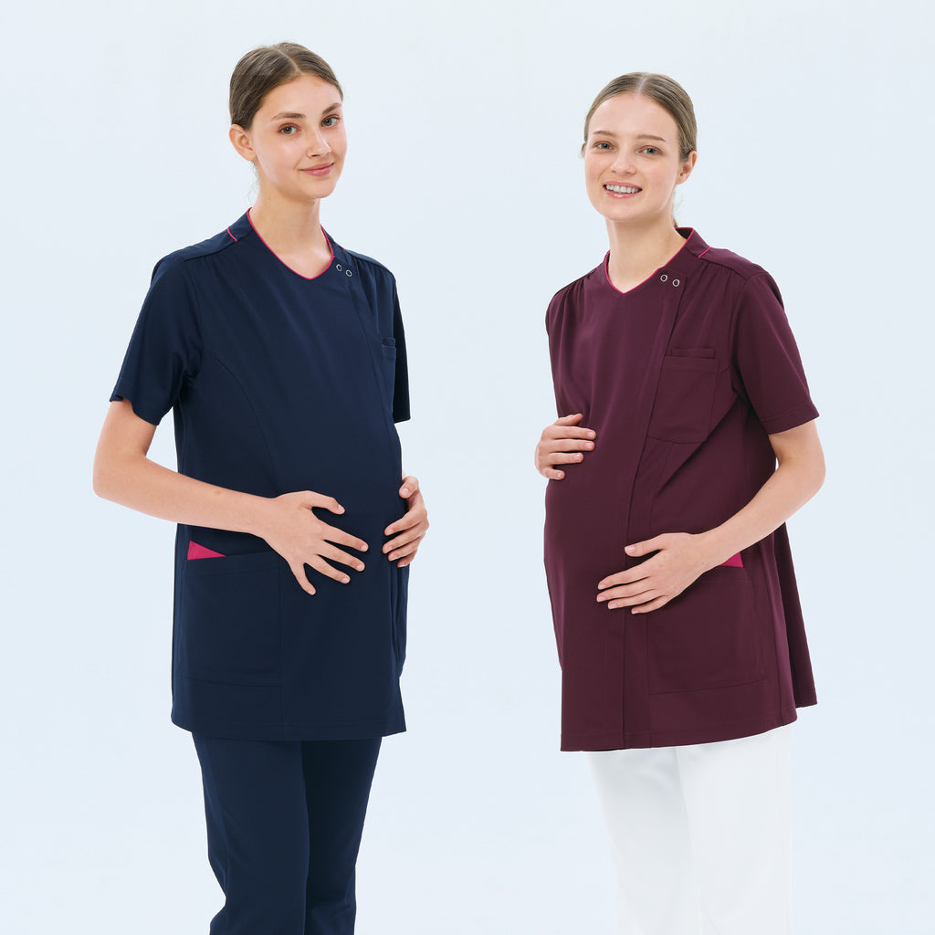 前開式的孕婦裝刷手衣。圓弧形領口和小小的褶皺感給人一種女性的溫柔印象。由柔軟的針織素材製成,穿著舒適。