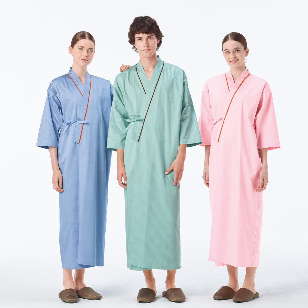 不會壓迫身體的剪裁設計。便於檢查和治療的浴衣式病人服。SG綿80% 聚酯纖維20%‧有立體感的條紋布‧含棉量高,吸汗性及舒適度極佳‧高強度耐久洗滌